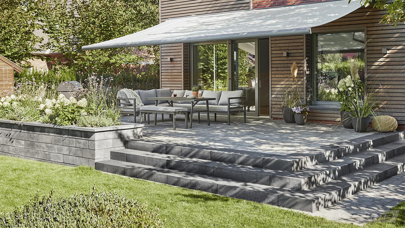 - kompakte Kassetten-Markise für mittelgroße Terrassen
