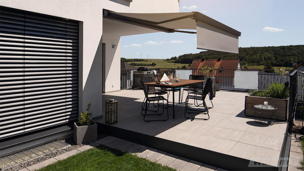 - kompakte Kassetten-Markise für mittelgroße Terrassen